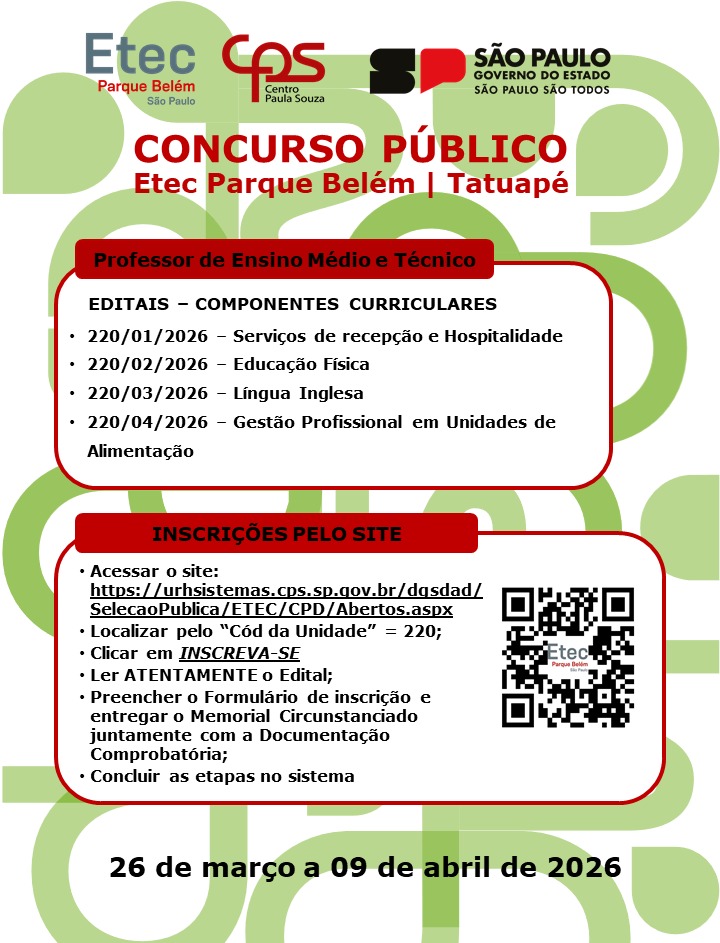Vagas Abertas! Inscreva-se no prazo! Dias 26/03/2026 a 09/04/2026. Entre no site ou escaneie o qr code para mais informações.
